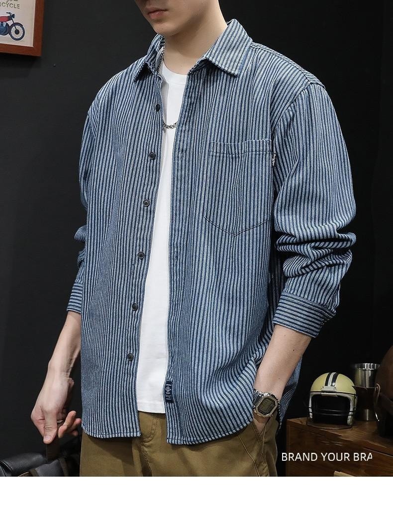 남자 스트라이프 아우터 셔츠 캐주얼 상의 데님 셔츠 긴팔 남자 셔츠